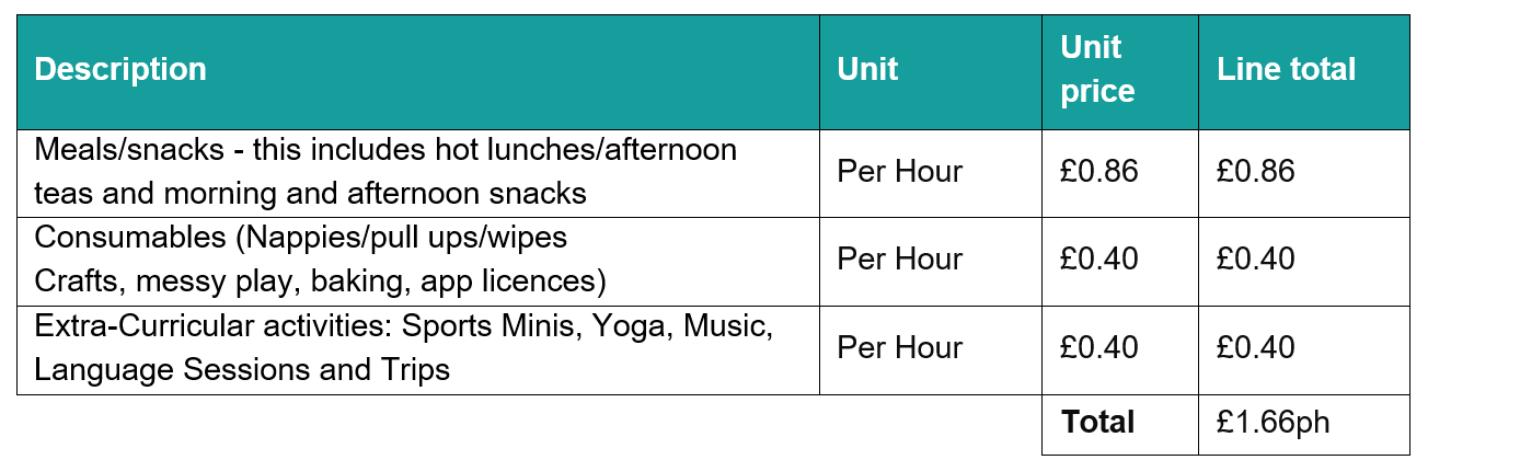 Our comprehensive "extras" package totals £1.66 per funded hour and is broken down as follows: